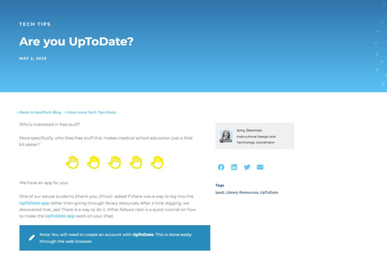 Medical students can now add the UpToDate app to their iPads. Check out a tutorial on MedTech’s blog site for more information.