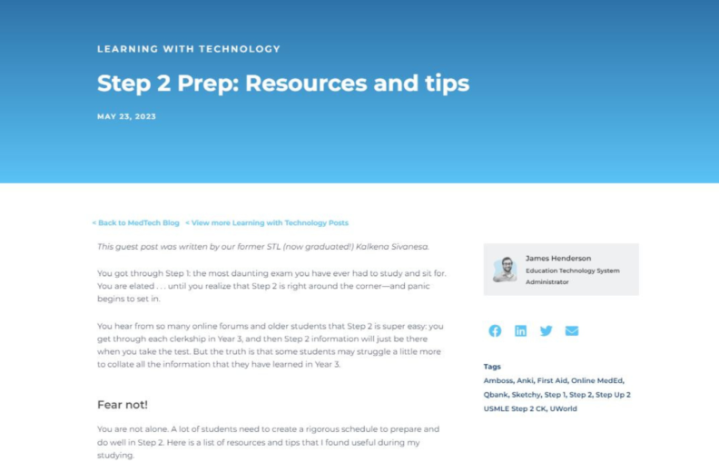 College of MedicineNewsStudent AnnouncementsStep 2 Prep: Resources and tips by Kalkena Sivanesam Step 2 Prep: Resources and tips by Kalkena Sivanesam May 24, 2023 Share on Twitter Share on FaceBook Share on Linkedin share with email share with link Recent graduate Dr. Kalkena Sivanesam wrote a post on MedTech’s blog to help MD students prepare for Step 2. Access the post here.